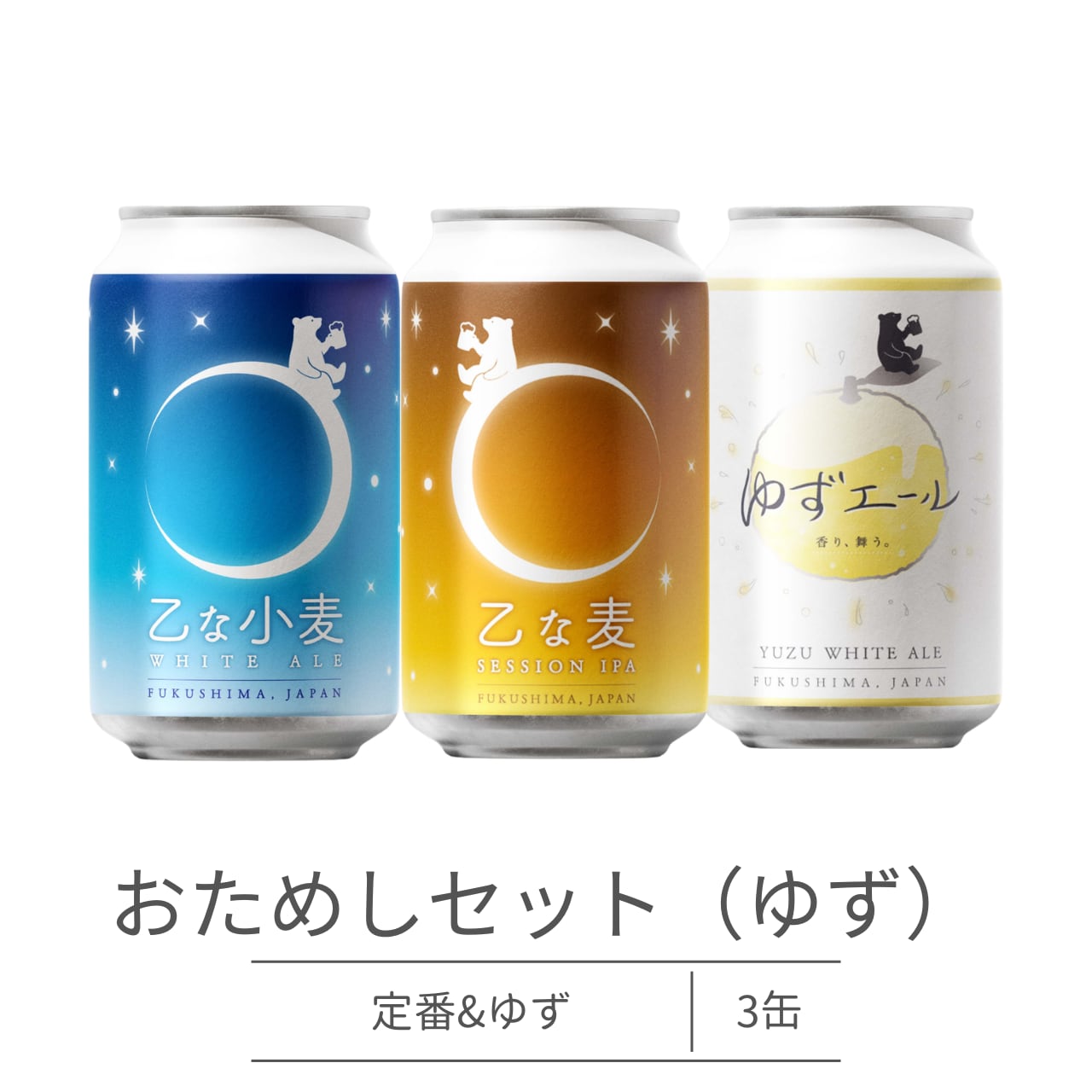 定番の「乙な麦 Session IPA」「乙な小麦 White Ale」に加え、玉川村産(福島県)ゆずを使用した「ゆずエール」を楽しめるお試しセットです。